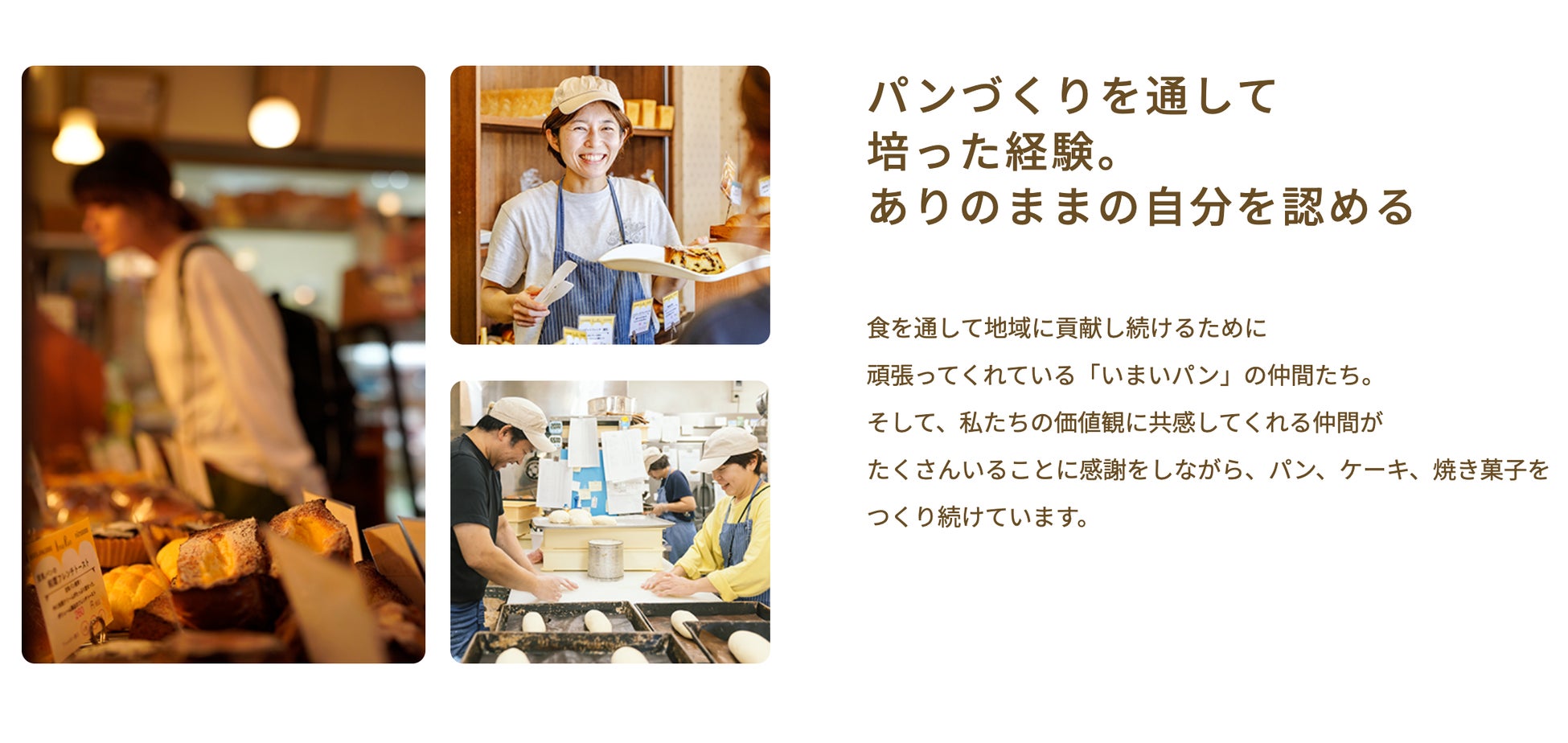 いまいパンは、提供するパンだけでなく、一緒に働く仲間たち、地域の人たち、そして、お客さま、いまいパンにかかわる全ての人たちの心を、パンを通じて育み、あたたかい関係性を築いています。