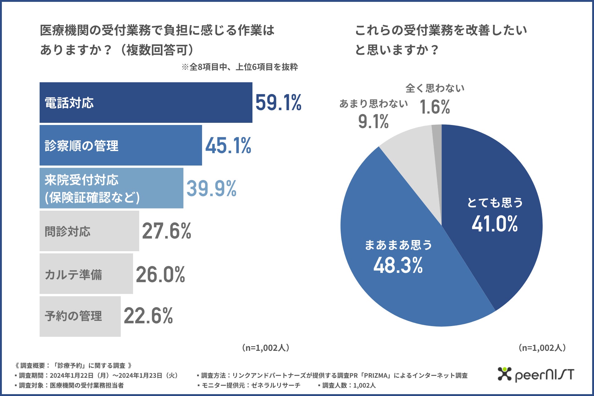 そこで今回、診療予約システム『QuiQ』(https://www.peernist.co.jp/products/quiq/)を運営する株式会社peerNISTは、医療機関の受付担当者を対象に、「診療予約」に関する調査を実施しました。