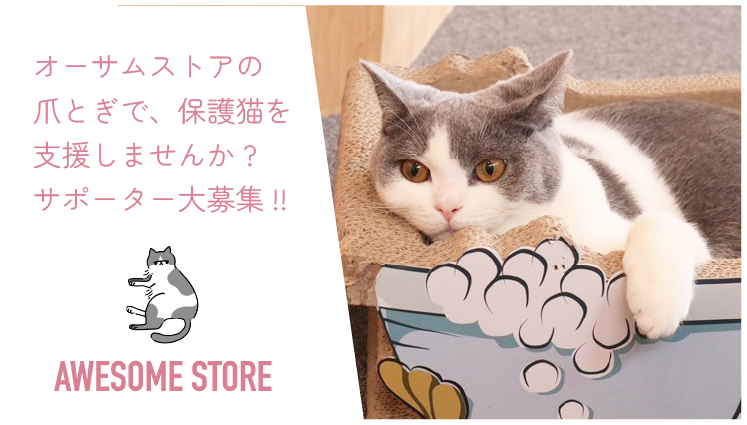 当社は、オーサムストアとして猫の爪とぎ事業を開始したことにより、この社会問題を解決したいという想いから、保護猫の活動も開始することとしました。活動内容としては、当社の猫の爪とぎを通じて、1匹でも多くの猫を幸せにするために、犬猫の保護と里親探し活動、猫の過剰繁殖防止活動を支援する基金 「オーサム基金」を設立し、商品の売上金の一部を動物愛護団体へ寄付するという仕組みで、お客様参加型の社会貢献活動を実施、殺処分ゼロの輪を広げていくことを目指しております。