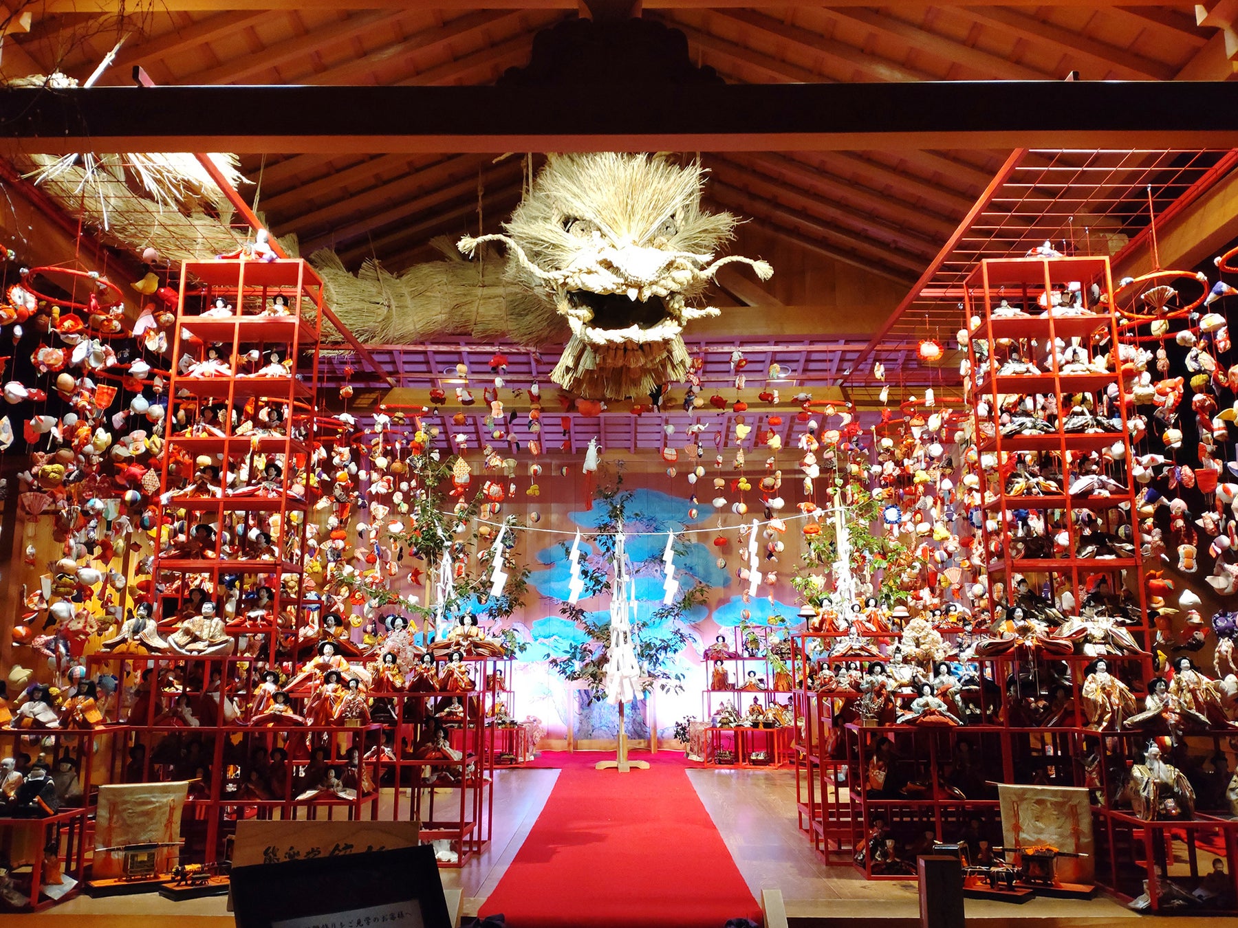 2千体雛飾りと同時に開催するようになったのは、お雛様の本来の意味(子供の成長や安全を祈る)と、ヤークー様の人々を病や厄災からお守りくださる意味と重なり、同時に展示をするようになりました。子供の早い成長時期と一年の早い時期の重なる意味合いもございます。