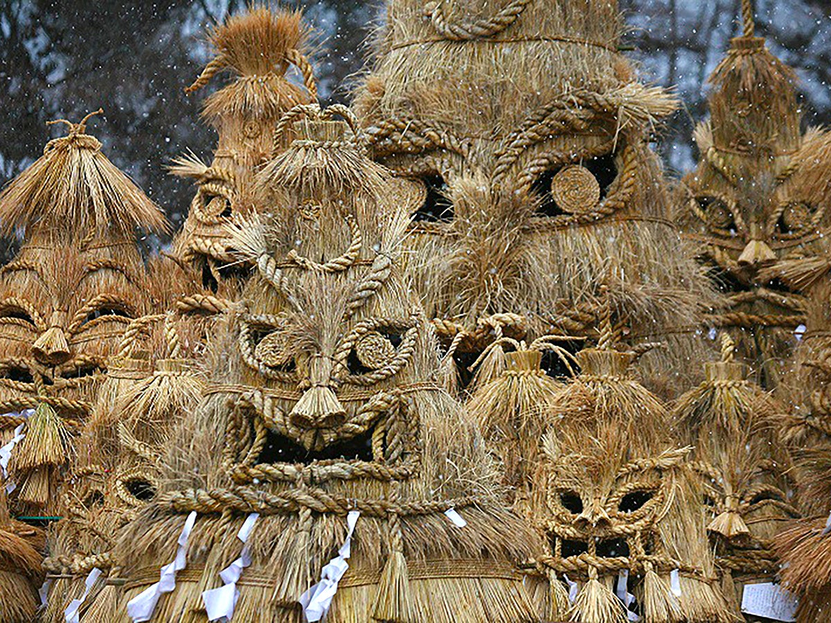 藁や竹などの自然素材をしめ縄や門松を作る手法で作られます。