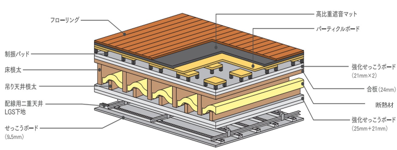 【当社独自技術、高性能遮音床システム「Mute(ミュート)」による