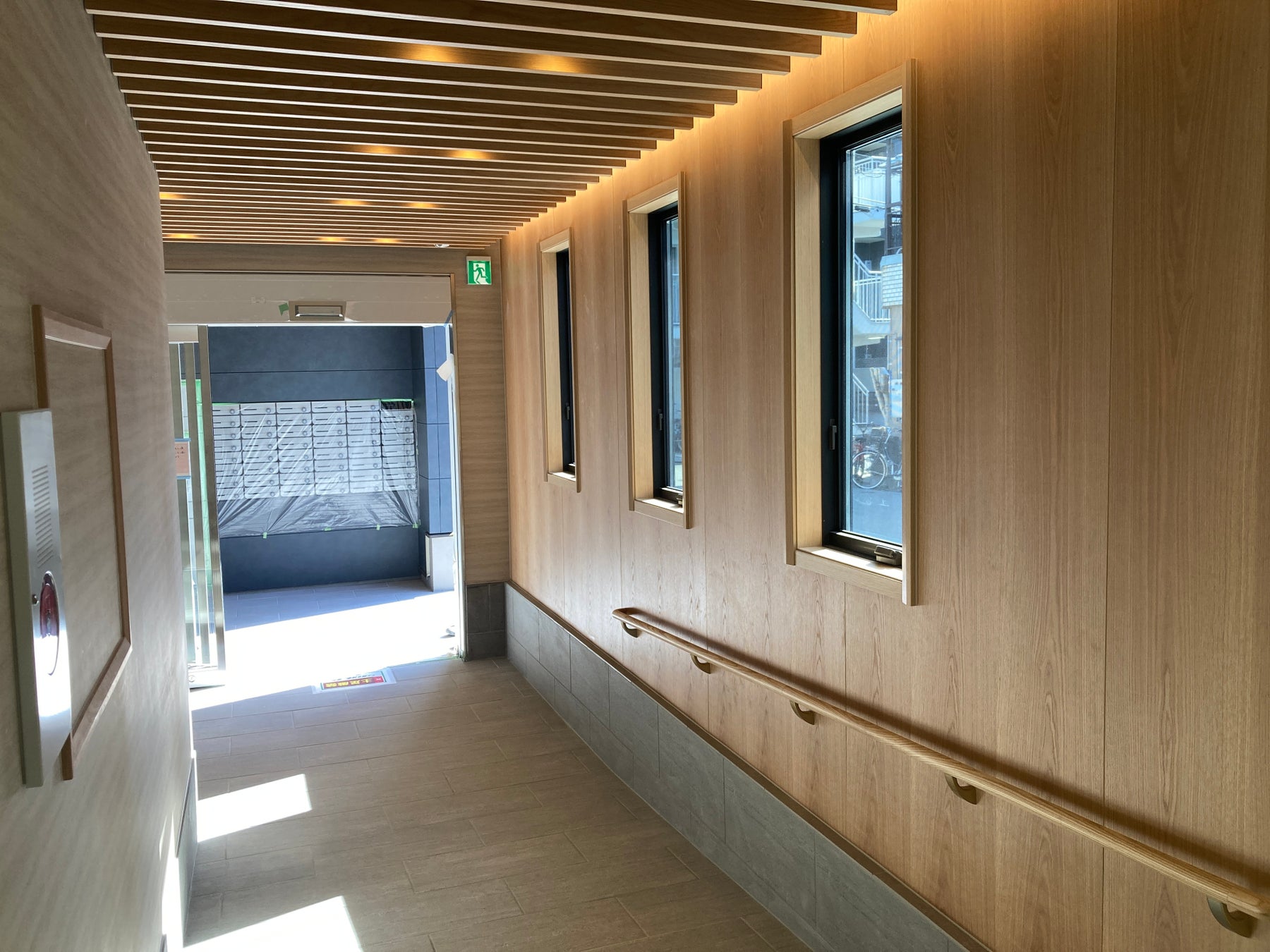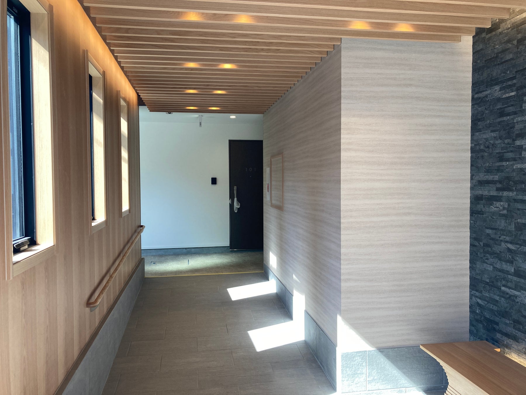 本物件は、構造躯体に循環型資材である「木」を使用しており、木造の特性である断熱性・気密性の高い建物となっています。エントランスの天井や壁の広範囲にも木を活用し、木の質感によりやさしくあたたかい雰囲気のインテリアとなっています。そして、木は年月を経て自然な色味の変化により魅力を増していき長期間楽しむことができます。構造躯体だけでなく 、内装にも木材を積極的に採用することで、昨今の木造利用促進法よる建築物への木造化・木質化の促進にもつながり、地球環境への配慮と脱炭素社会の実現に寄与いたします。