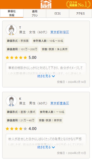 この新機能により、消費者は自身と同じ性別や年代、かつ検討している葬儀を行った人の口コミを参考にして、最適な葬儀社を簡単に見つけることができます。