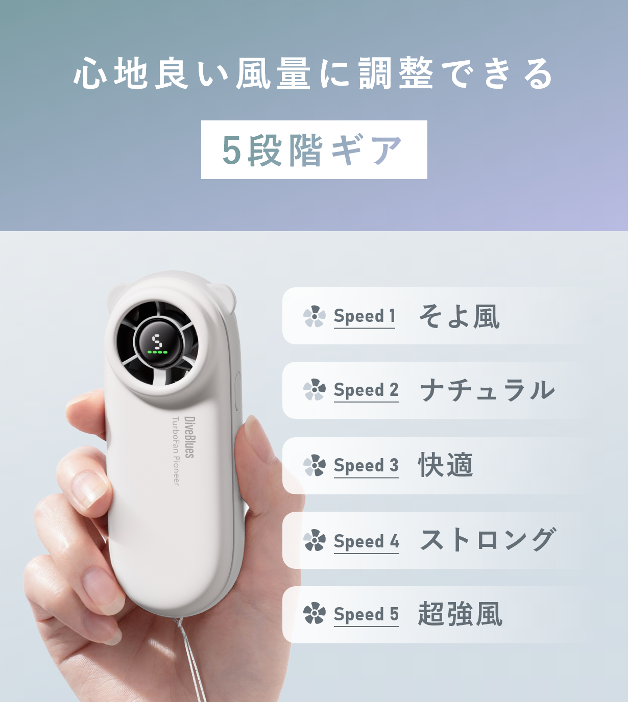 5段階で風量を調整できるため、気温やシチュエーションに応じて最適な風を選べます。