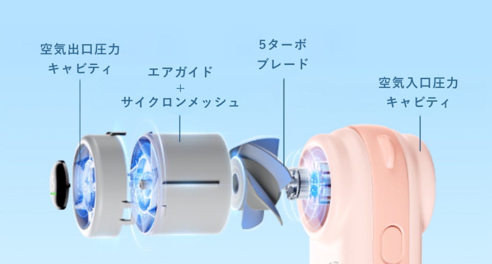 第1層は広範囲に空気を取り込む吸気口、第2層では空気を均一に整えるプレフィルターを搭載。第3層のターボファンブレードが空気を強力に押し出し、第4層のエアフローフィンが風をスムーズに流します。そして最後の第5層で、ムラのない自然な風を生み出すことで、心地よく持続する涼しさを実現しています。