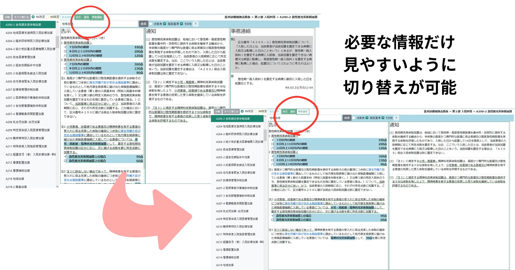 必要に応じて告示と通知のみ等の表示の切り替えができます。必要な情報のみを表示できるので、ご利用の端末の画面に合わせて、表示方法を切り替えて見ていただけます。