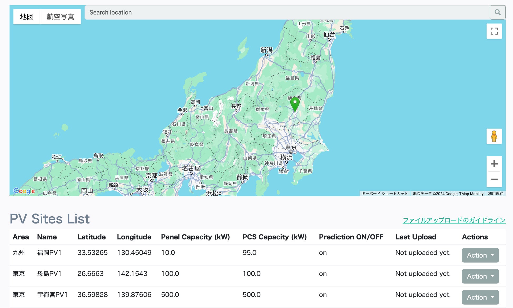 発電設備の地点を登録するだけで、気象予報を自動で取得し、発電予測が可能。