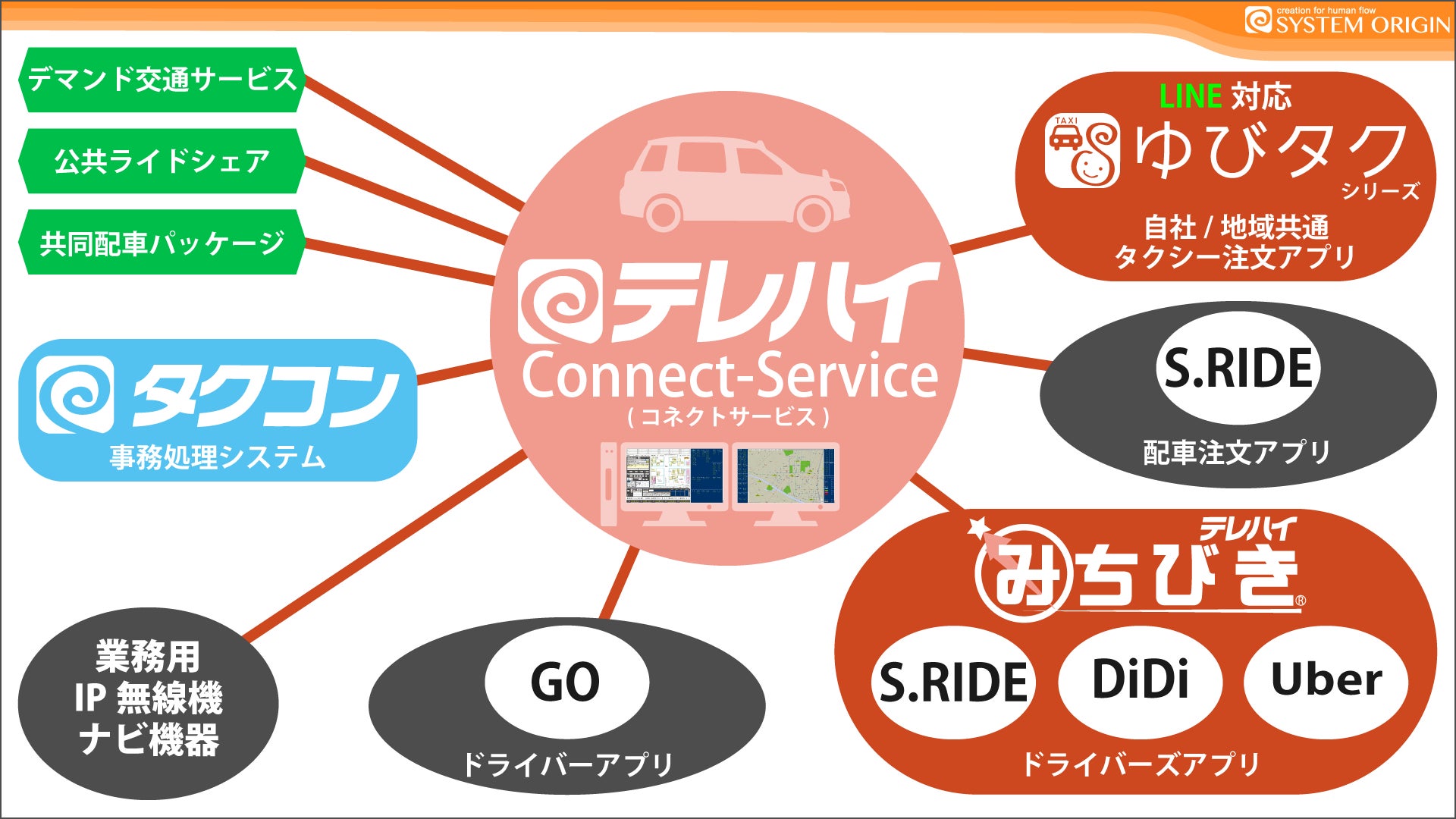 これまで、時代の変化に伴い様々な機器やサービスとの連動に対応してきました。タクシー無線GPS-AVM機器との連携、『GO』ドライバーアプリとの連携版の開発、テレハイみちびきの連動、S.RIDE配車アプリ連携、LINEタクシー注文連携 等々。