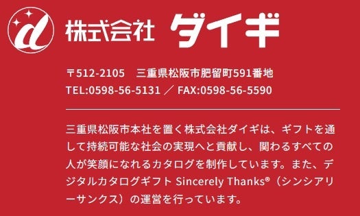 「Sincerely Thanks®」は、創業50年余の株式会社ダイギが長年の経験を元に、これまでのカタログギフトの常識を打ち破り、ただ「贈る」「受け取る」だけではなく、ギフトを通して産業支援や地域発展といった持続可能な社会の実現へと貢献し、関わるすべての人が笑顔になれる