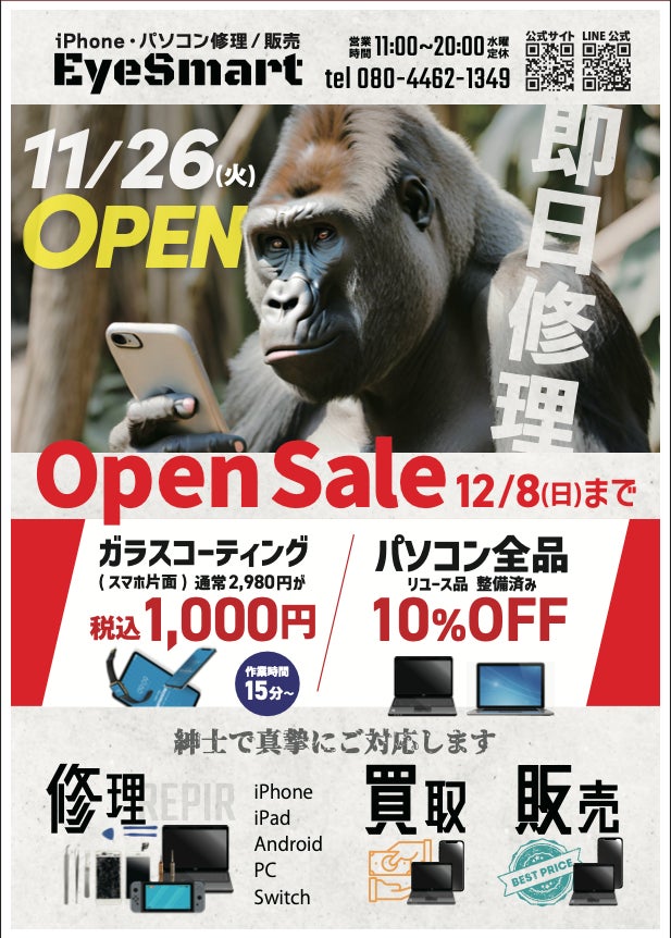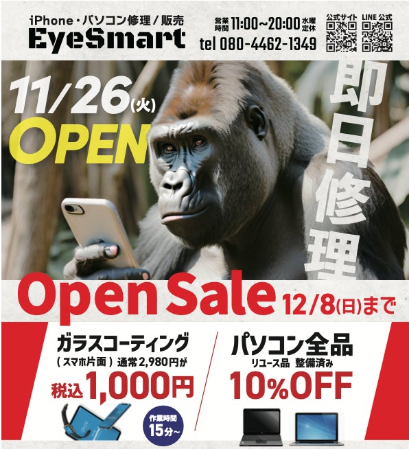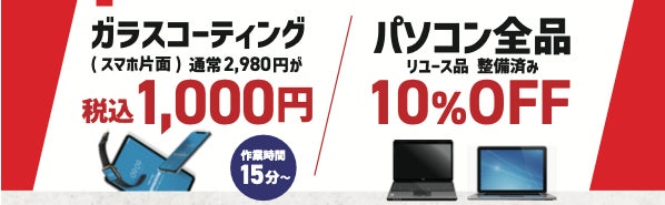 これを記念し、スマホやスマートウォッチのガラスコーティングが1,000円、中古パソコンが店頭価格から10%オフとなるオープン記念キャンペーンを実施いたします。