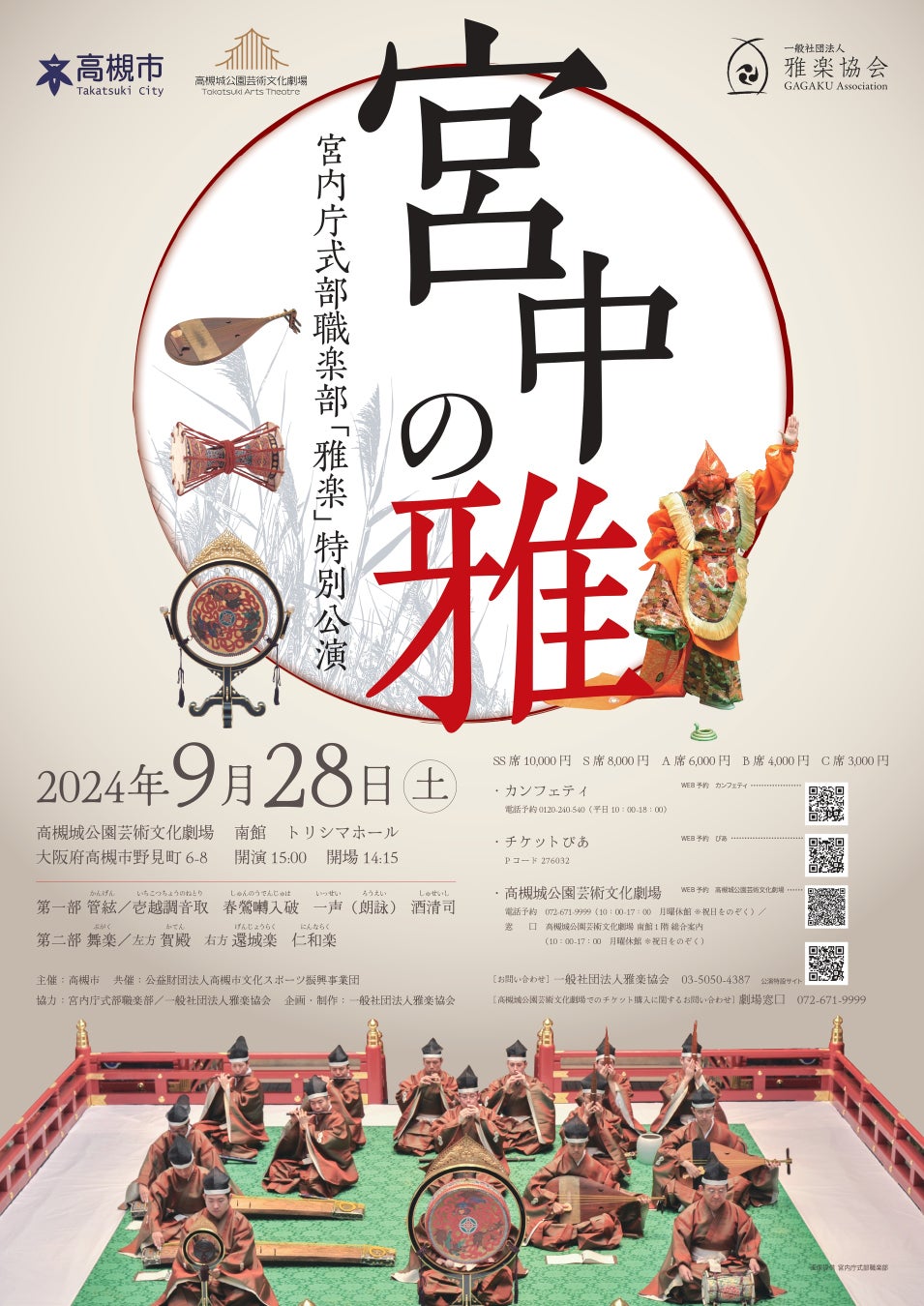 宮中の雅~宮内庁式部職楽部「雅楽」特別公演(於:高槻城公園芸術文化劇場) 主催:高槻市 共催:公益財団法人高槻市文化スポーツ振興事業団 協力:宮内庁式部職楽部 企画・制作・協力:一般社団法人雅楽協会