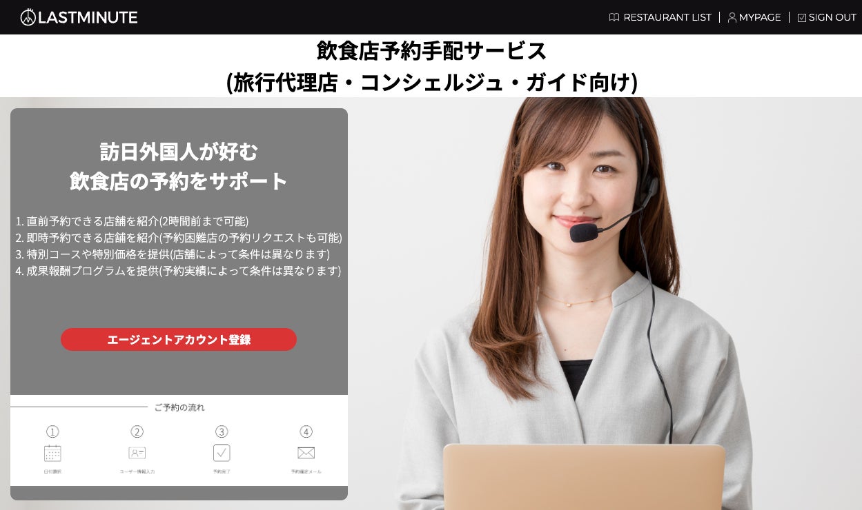 株式会社Yummy Guide(本社: 東京都台東区、代表取締役CEO:小林寛幸)が運営する訪日外国人向け飲食店予約サイト「LASTMINUTE」は、旅行会社・コンシェルジュ・ガイド向け予約システムを正式リリース致しました。