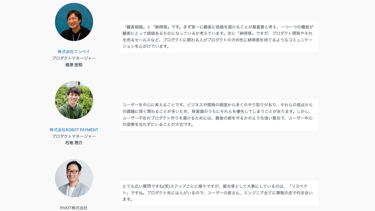 初回は「プロダクト作りで意識していることや大切にしていることは何ですか?」の質問に、計22名のPMたちにご回答いただいています!