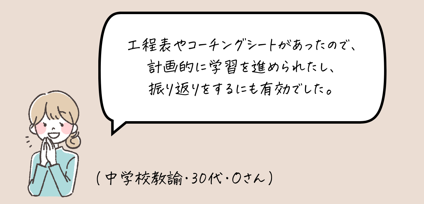 ・工程表やコーチングシートがあったので、計画的に学習を進められたし、振り返りをするにも有効でした。