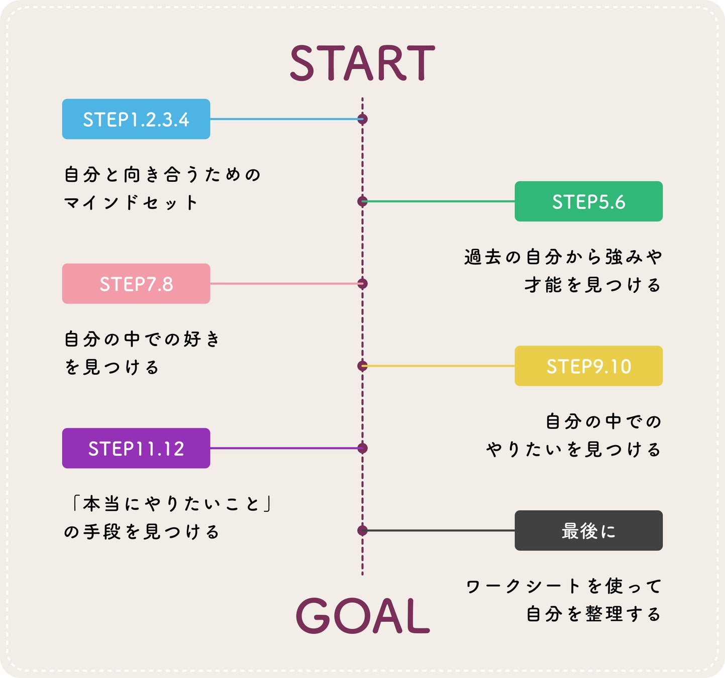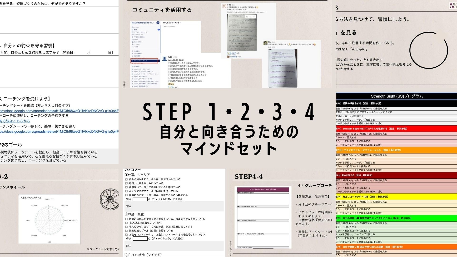 STEP1〜12の動画教材で自分自身を見つめなおし強みや才能を見つけていくワークをメインコンテンツとしています。