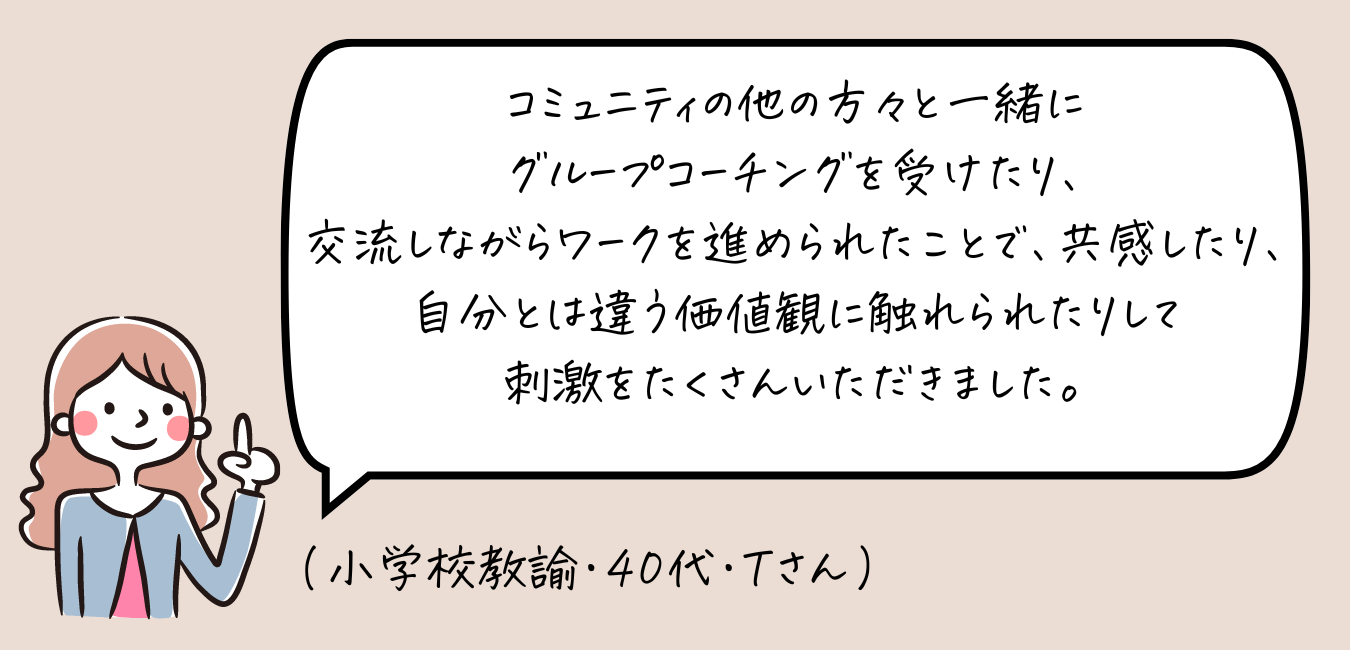 ・コミュニティの他の方々と一緒にグループコーチングを受けたり、交流しながらワークを進められたことで、共感したり、自分とは違う価値観に触れられたりして刺激をたくさんいただきました。