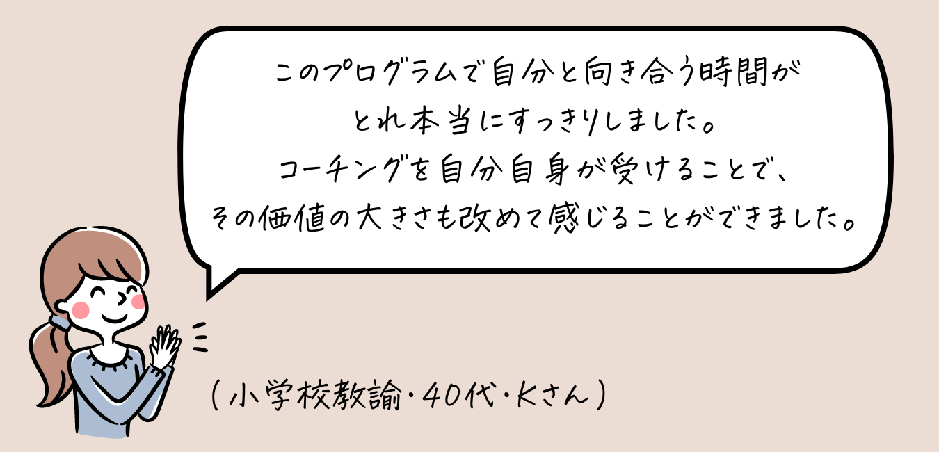 ・このプログラムで自分と向き合う時間がとれ本当にすっきりしました。コーチングを自分自身が受けることで、その価値の大きさも改めて感じることができました。