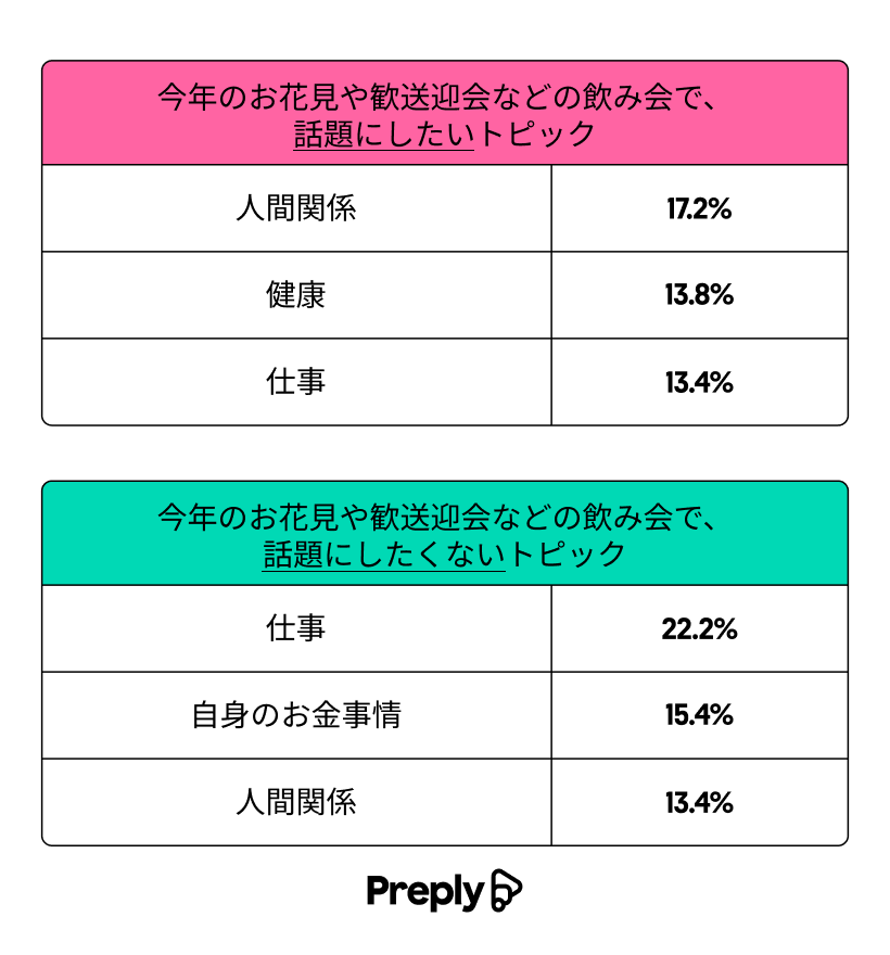 今までの経験から、「お花見中に帰りたいと思ったことがある」と回答した人は41.7%にのぼりました。帰りたい理由のトップは「寒いから」(58.7%)。続く第2位は「他の参加者に気を遣うのが疲れるから」(37.0%)。まだまだ肌寒い3月下旬〜4月に、外で周りの人に気配りをするのは疲れるのかもしれません。