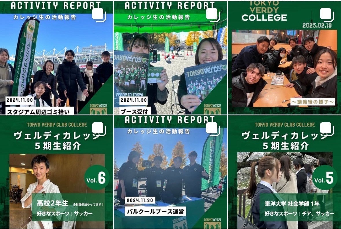 5期生の中でクリエイティブに関心のある学生を中心に「SNS部」を結成し、東京ヴェルディクラブカレッジのInstagramアカウントの運用を担当しました。未来のカレッジ生に想いが届くよう、写真やリールを含む約60件の投稿を制作し、さまざまな表現やアプローチに挑戦しました。