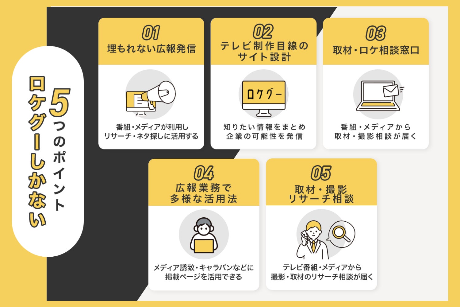 ロケグーは、テレビ制作者目線で開発したロケ地検索サイトの機能を持つ、新たな広報プラットフォームになります。