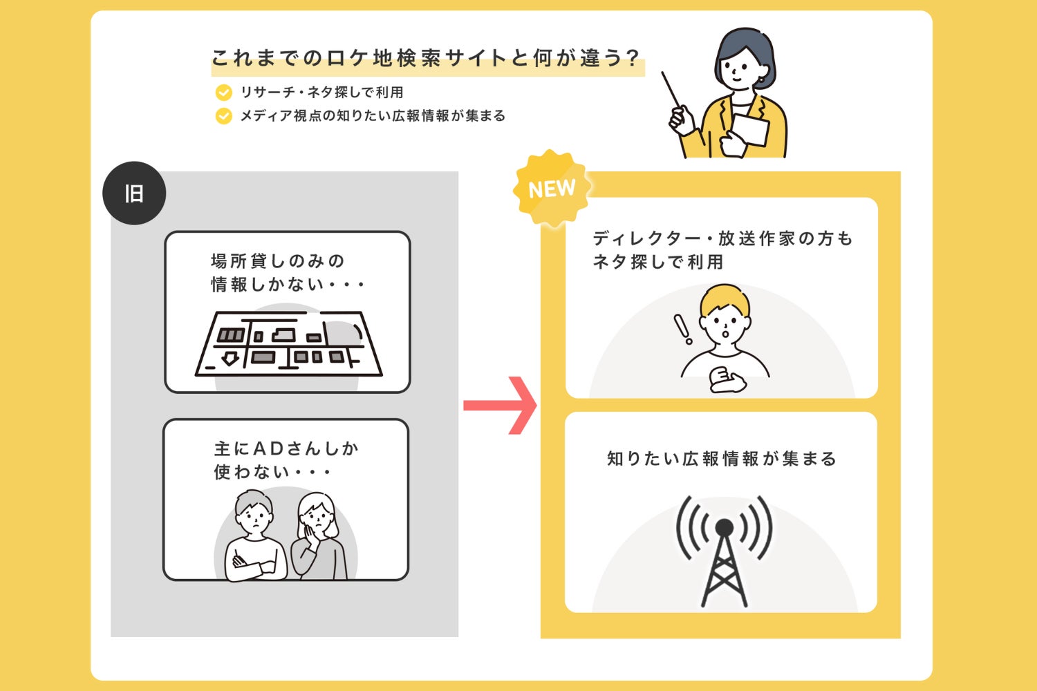 面白い、楽しい番組・作品を作るために、毎日ずっと企画を考え、ネタを探し、ロケ地、取材先などリサーチを行う番組制作者、映像制作者にとっては、「もっと簡単に!知りたかった!見つけたかった!」企業や施設が見つかるロケ地検索サイトになっています。