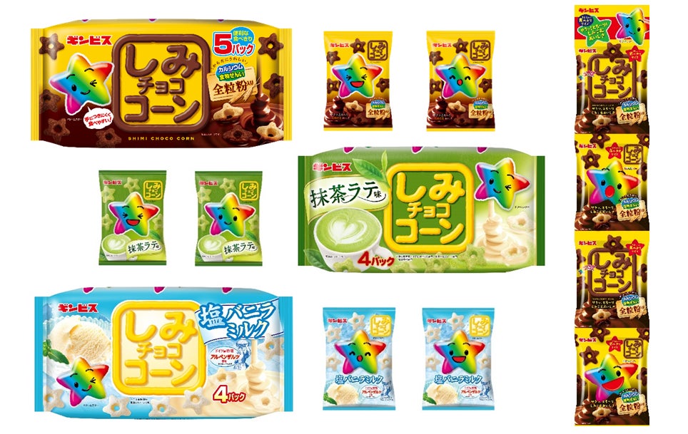 「しみチョココーン全粒粉 5P」「しみチョココーン抹茶ラテ味 4P」「しみチョココーン塩バニラミルク 4P」「しみチョココーン全粒粉4連」の小袋パッケージにはさまざまな表情をしたドリームスターが登場!親子の会話を盛り上げます。