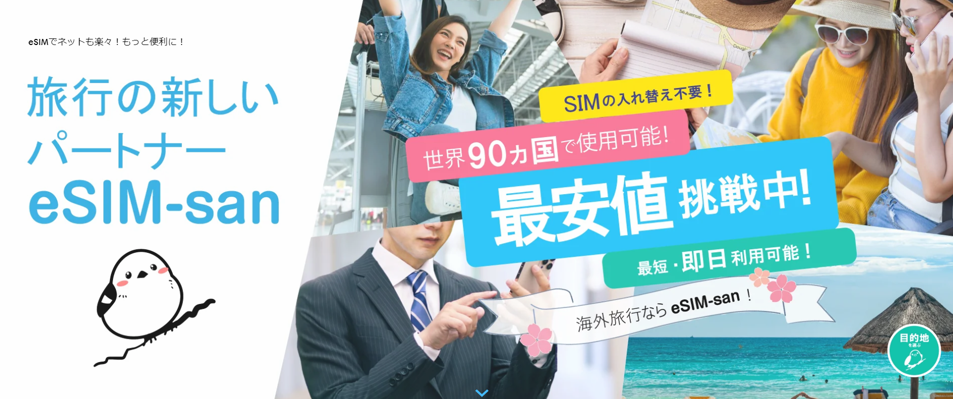 「eSIM-san(イーシムさん)」は、世界90か国以上の国と地域で利用できるeSIMを利用した海外インターネット接続サービスです。