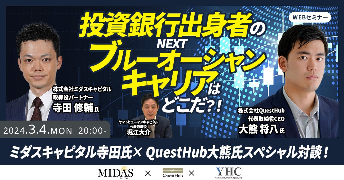 ヤマトヒューマンキャピタル株式会社(本社:東京都千代田区、代表取締役:堀江 大介)は、2024年3月4日(月)20:00よりオンラインにて、株式会社ミダスキャピタル取締役パートナー寺田修輔氏と株式会社QuestHub代表取締役CEO大熊将八氏にご登壇いただくウェビナー『 投資銀行出身者のNEXTブルーオーシャンキャリアはどこだ?!』を開催いたします。