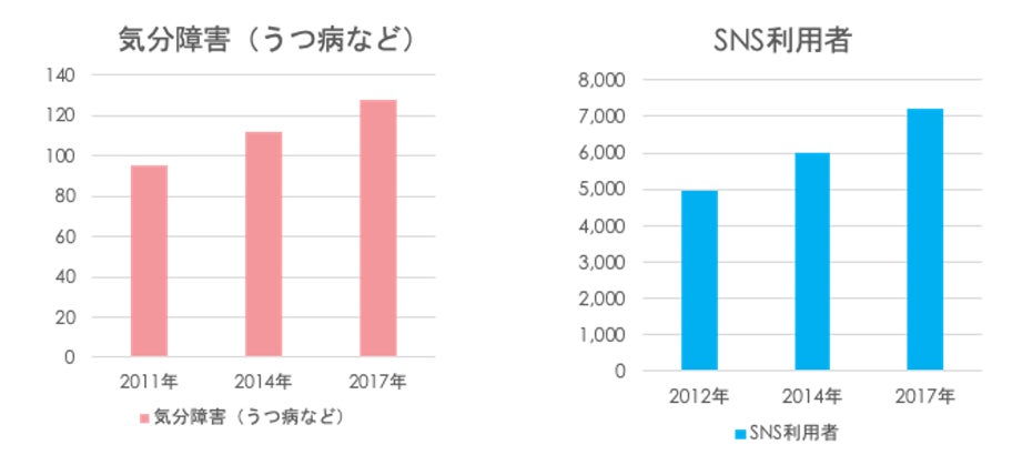 SNS利用者数の増加と共に、気分障害件数も同じように推移しており、弊社は毎日休まず133分も使用しているSNSがメンタルヘルスへの影響を与えていると考えています。