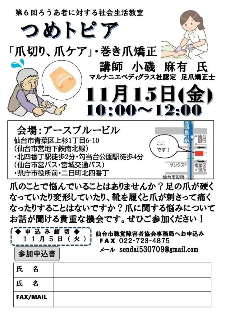 11/15仙台 聴覚障害を持つ高齢者向けに「足の爪切り・爪ケア」を伝える社会生活教室開催。仙台市聴覚障害者協会と民間の訪問型爪切り事業者が初めてのコラボレーション。