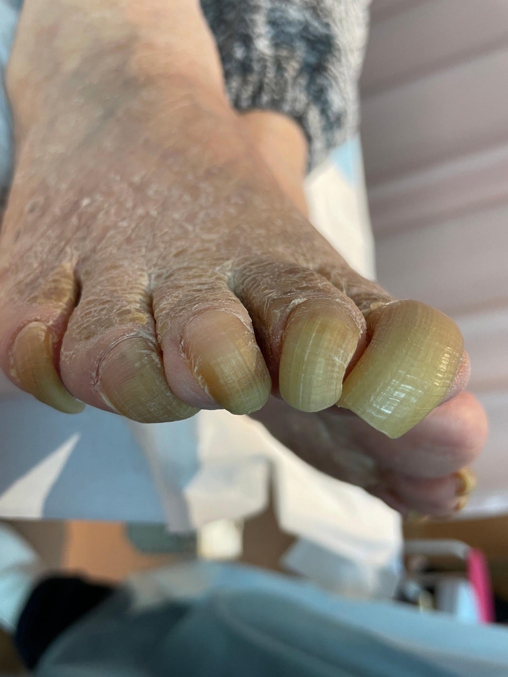 視力や握力の低下、屈めないといった理由で自分の足の爪を切れずに困っている「爪難民」は、全国に700万人以上いると言われています(日本フットケア学会による)。中には2年以上、足の爪を切らずに放置するケースもあり、硬く厚く変形した爪が原因で、靴下が履けない・靴が履けない・布団に爪が引っ掛かって安眠できないなど生活に支障をきたす場合も多くあります。