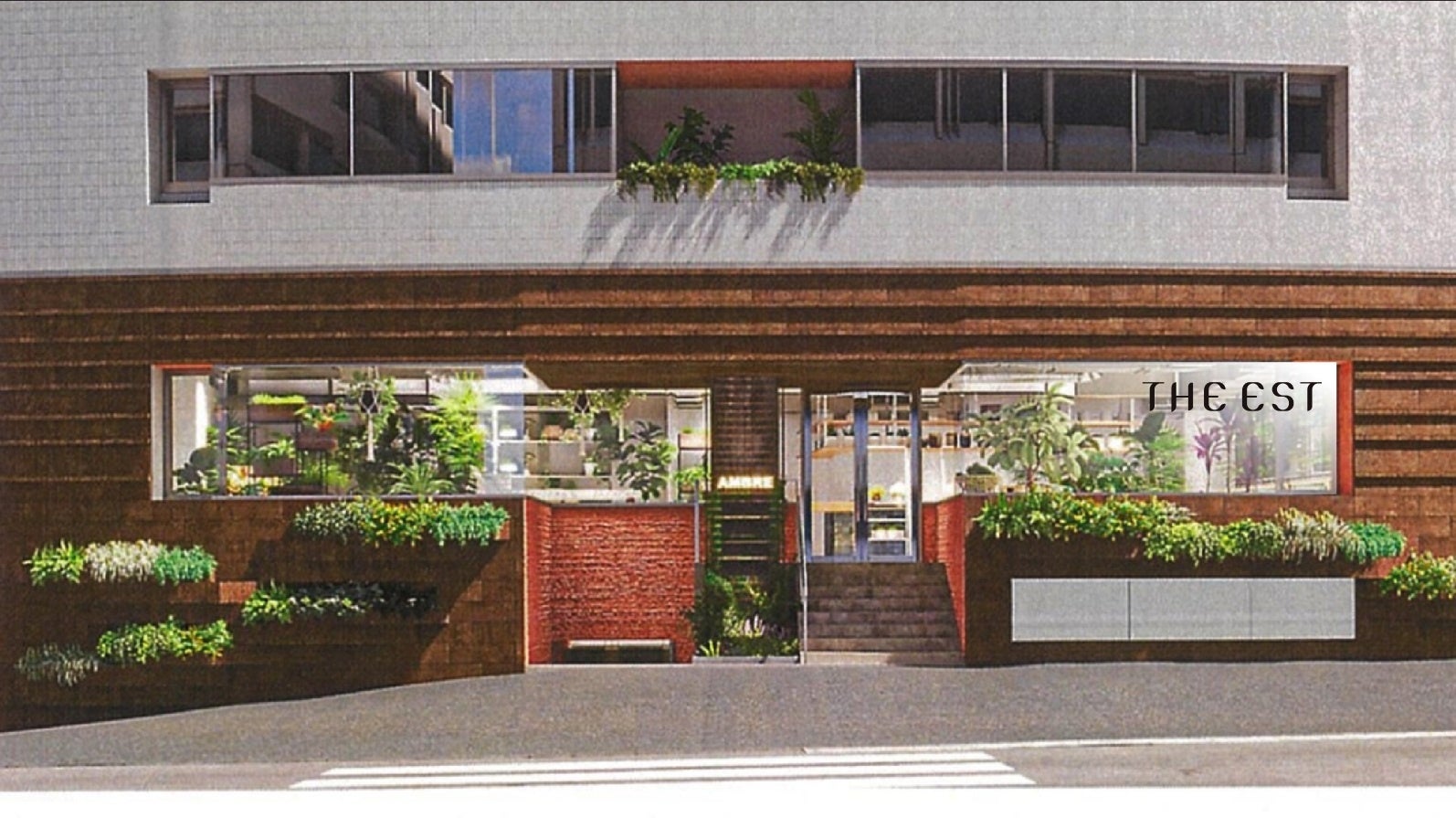 AMBREの路面階には当社のオフィスとメグラス初となるShowroom『THE EST』が2024年7月にオープンいたします。Showroom『THE EST』は、「植物で作る the estな空間と 植物で彩る the est な瞬間を」をコンセプトに、植物の展示・貸出・販売をおこないます。長きにわたり植物業界に身を置いてきたスタッフがセレクトした、市場では出回ることのない、1点ものの植物を実際に見ていただくことができます。また、これまで一部のご依頼にてお受けしていた、当社のグリーンクリエイターが造るアーティフィシャルフラワー×生の植物を組み合わせたインテリアグリーン等の作品も販売予定です。