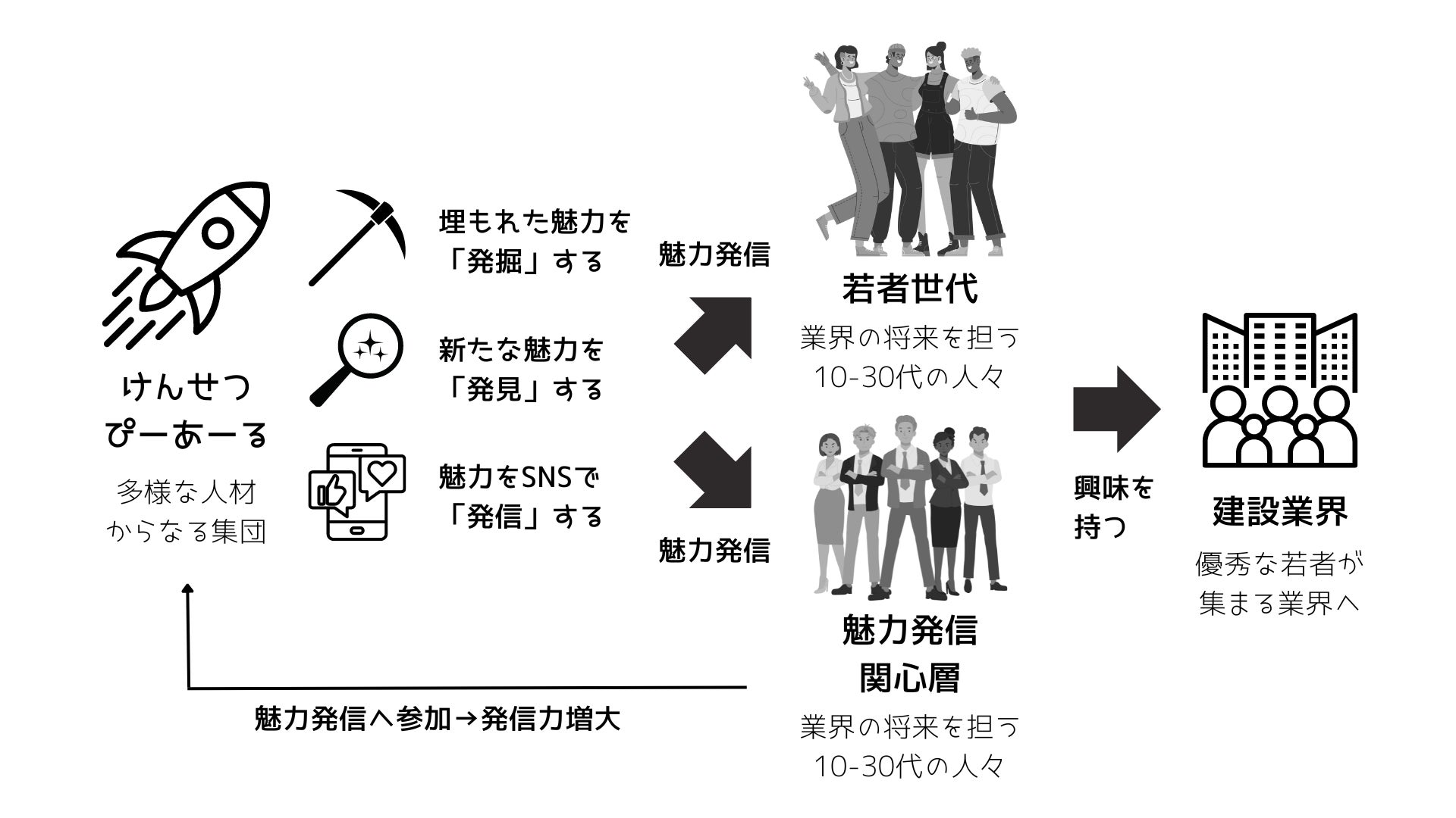 建設業界は人々の生活や経済発展の基盤となる建物やインフラを生み出す重要な役割を担っています。しかしながら、少子高齢化および魅力低下による人材不足という深刻な課題を抱えています。そこで、「けんせつぴーあーる」では「建設」および「建設が生み出すもの」の魅力発信に関心のある多様な人々を集め、建設業界を「優秀な若者が集まる魅力的な業界」にするべく取り組んでいます。