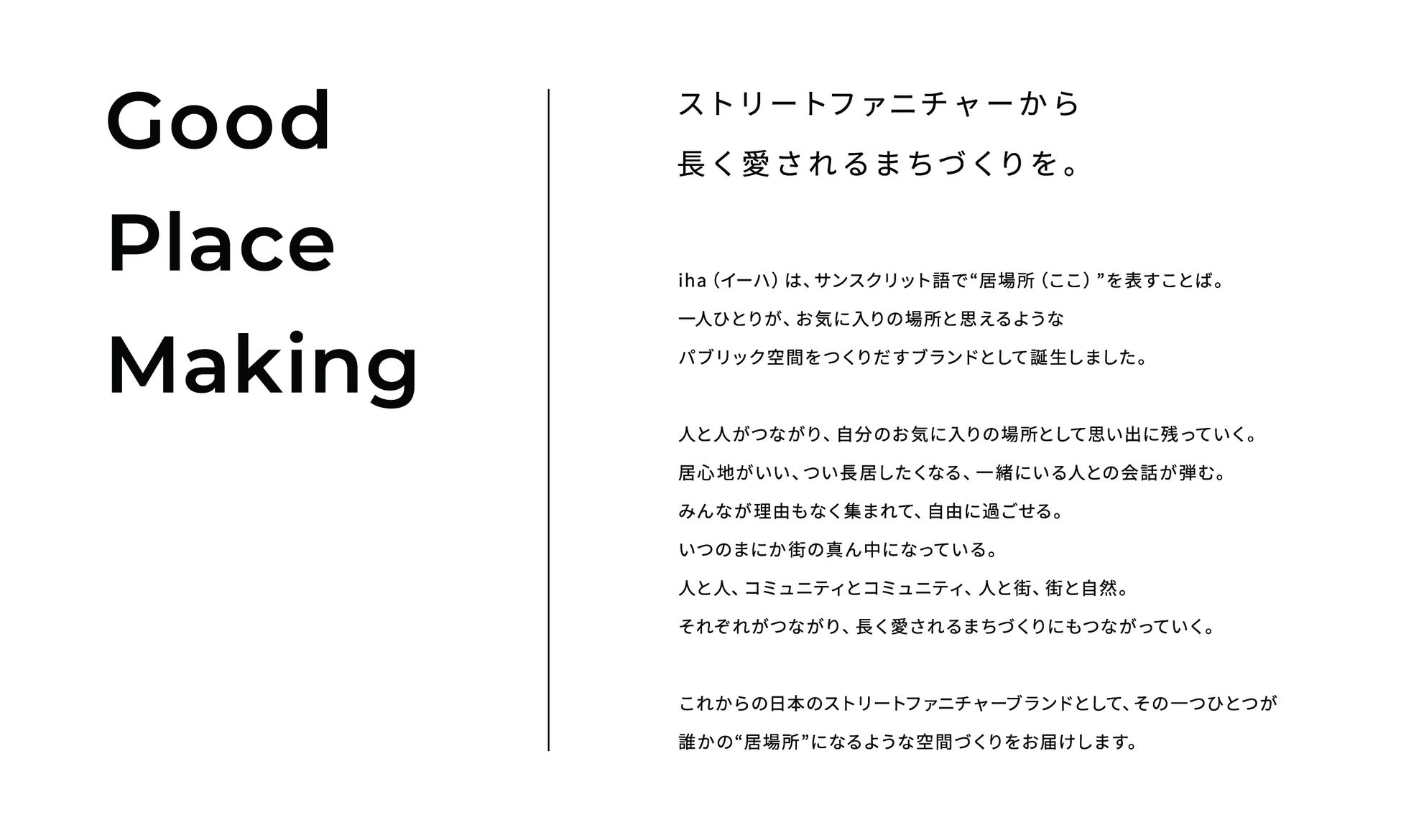 ihaは、「Good Place Making(グッド・プレイス・メイキング)」をコンセプトに、これからの日本のストリートファニチャーブランドとして、長く愛されるまちづくりに貢献し、誰かの”居場所”になるような空間づくりをお届けしていきます。