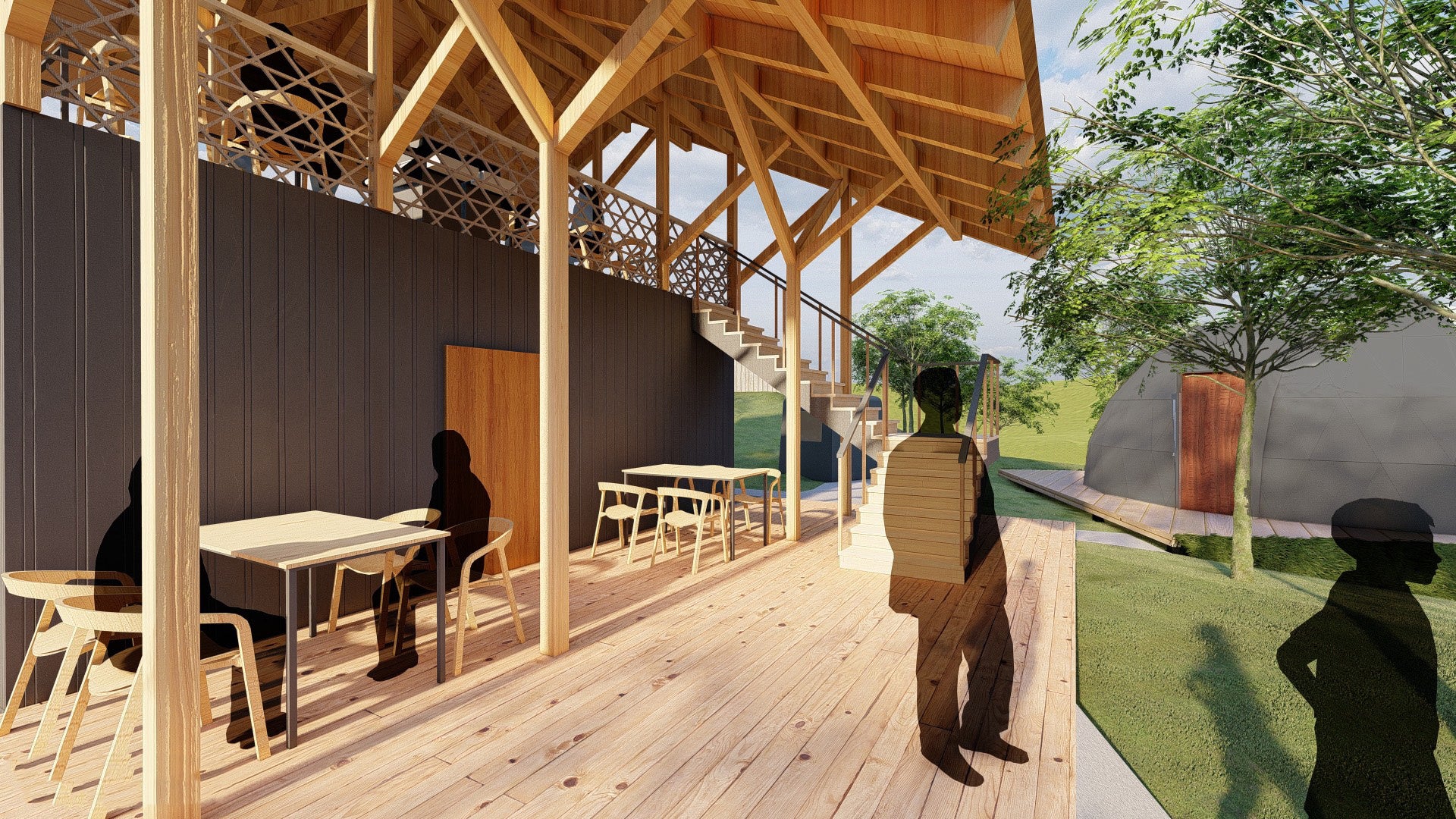 ドーム型客室は全4棟。ホテル並みの設備と充実のアメニティを備えます。メイン棟2階のテラスではBBQをお召し上がりいただけます。また、メイン棟で食事や飲み物を販売(予定)のため、準備も片付けもいらない快適なグランピングをご満喫いただけます。