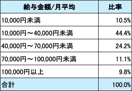100,000円以上の収入を得ているワーカー9.8%を含め、40,000円以上の収入を得ているワーカーが全体の45.1%。10,000円〜40,000円未満の44.4%を加えると実に全体の89.5%が単発ではなく継続勤務となっている。
