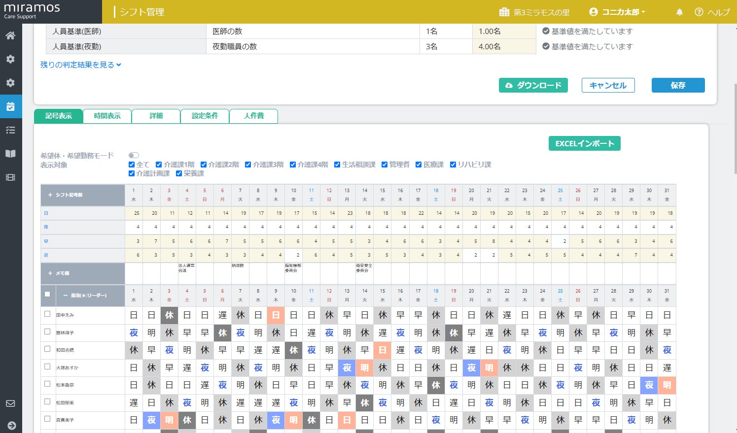 「シフト表作成時間の大幅削減に加え、フロアごとに異なっていた勤務ルールを、miramosの導入を機に標準化することができ、業務の効率化が進みました。また、勤務形態一覧表の使い勝手も非常に良く、特別な調整が不要で大変助かっています。さらに、加算に関する項目が正確に可視化されている点は、経営の安定にとっても重要で、大きなメリットと感じています。」