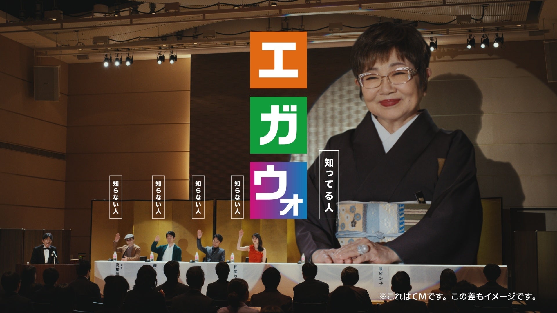ドラマ制作発表会風の会場が舞台。フォークデュオ「あのねのね」の原田伸郎さん司会のもと、エガウォのお得さを記者たちに発信します。最後は記者たちの「ピン子さん、笑顔(エガウォ)ください」の大合唱で、新サービス「エガウォ」の名前を印象づけています。
