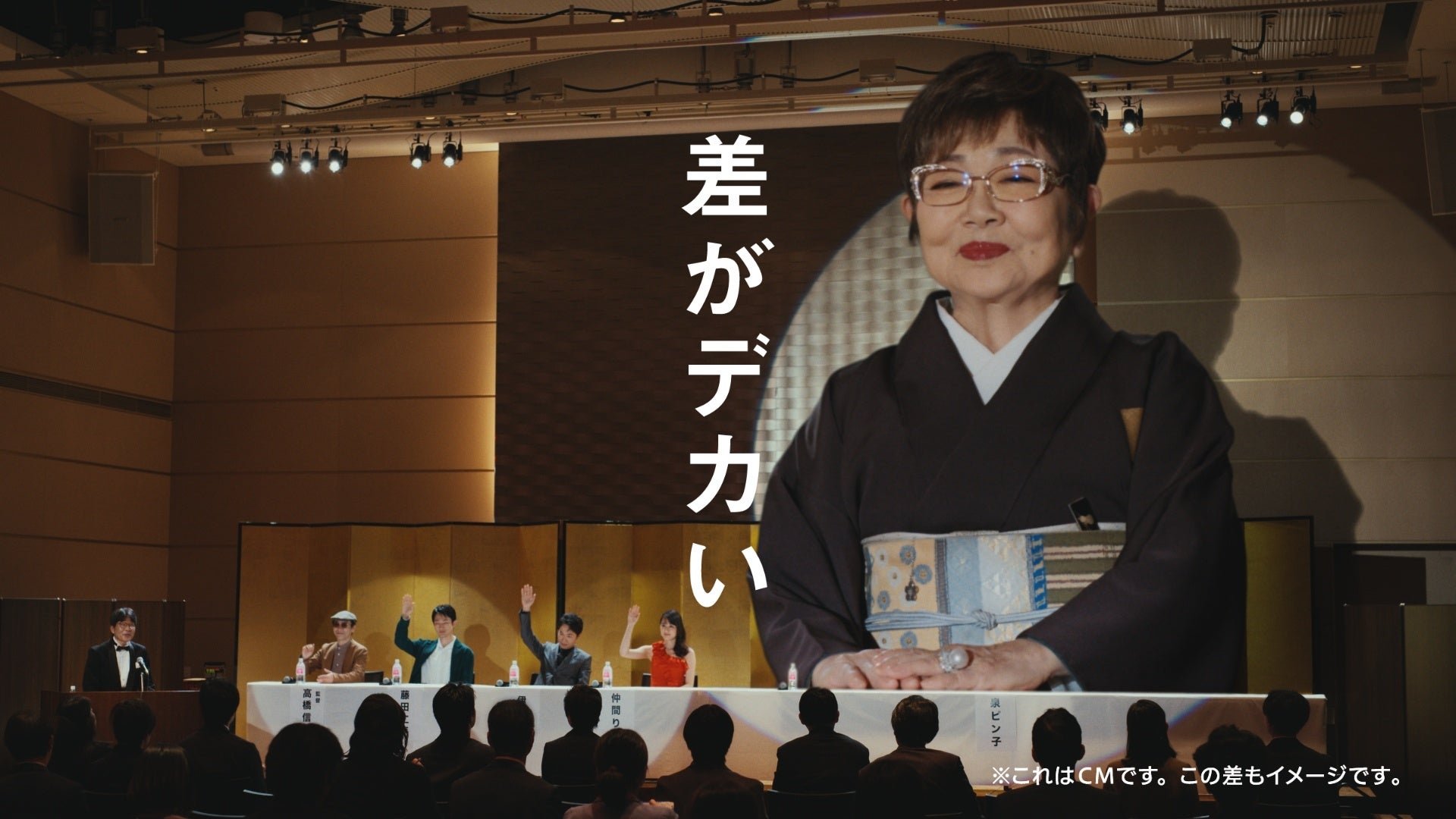 今回の新CMでは、「エガウォ」それぞれに乗り換えると超お得なメリットを直感的に伝えるため、「そのお得さを知っている人と知らない人との差」を、泉ピン子さんと他の演者さんたちの“大きさの違い”によって視覚化。まさに”大女優”泉ピン子さんならではのチャーミングで、インパクトの強い作品に仕上がっています。