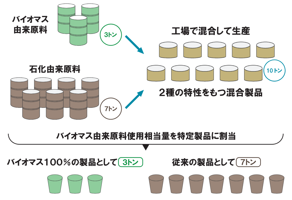 ある特性を持った原料(バイオマス由来原料)がそうでない原料(石化由来原料)と混合される場合、その特性を持った原料の投入量に応じて、製品の一部に対してその特性の割り当てを行う手法。