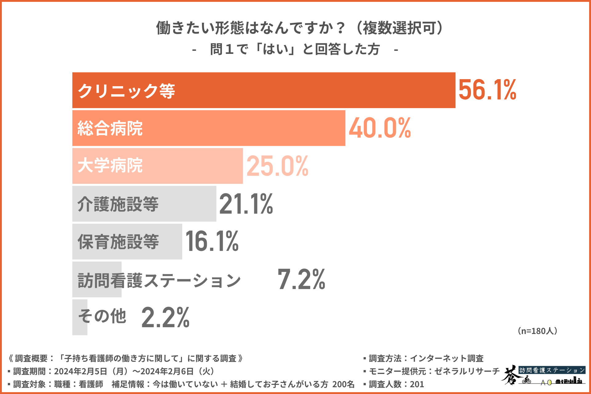 前述の質問で育児と両立できたら働きたいと回答した方に「働きたい形態はなんですか?(複数選択可)」と質問したところ、『クリニック等(56.1%)』と回答した方が最も多く、次いで『総合病院(40.0%)』『大学病院(25.0%)』と続きました。