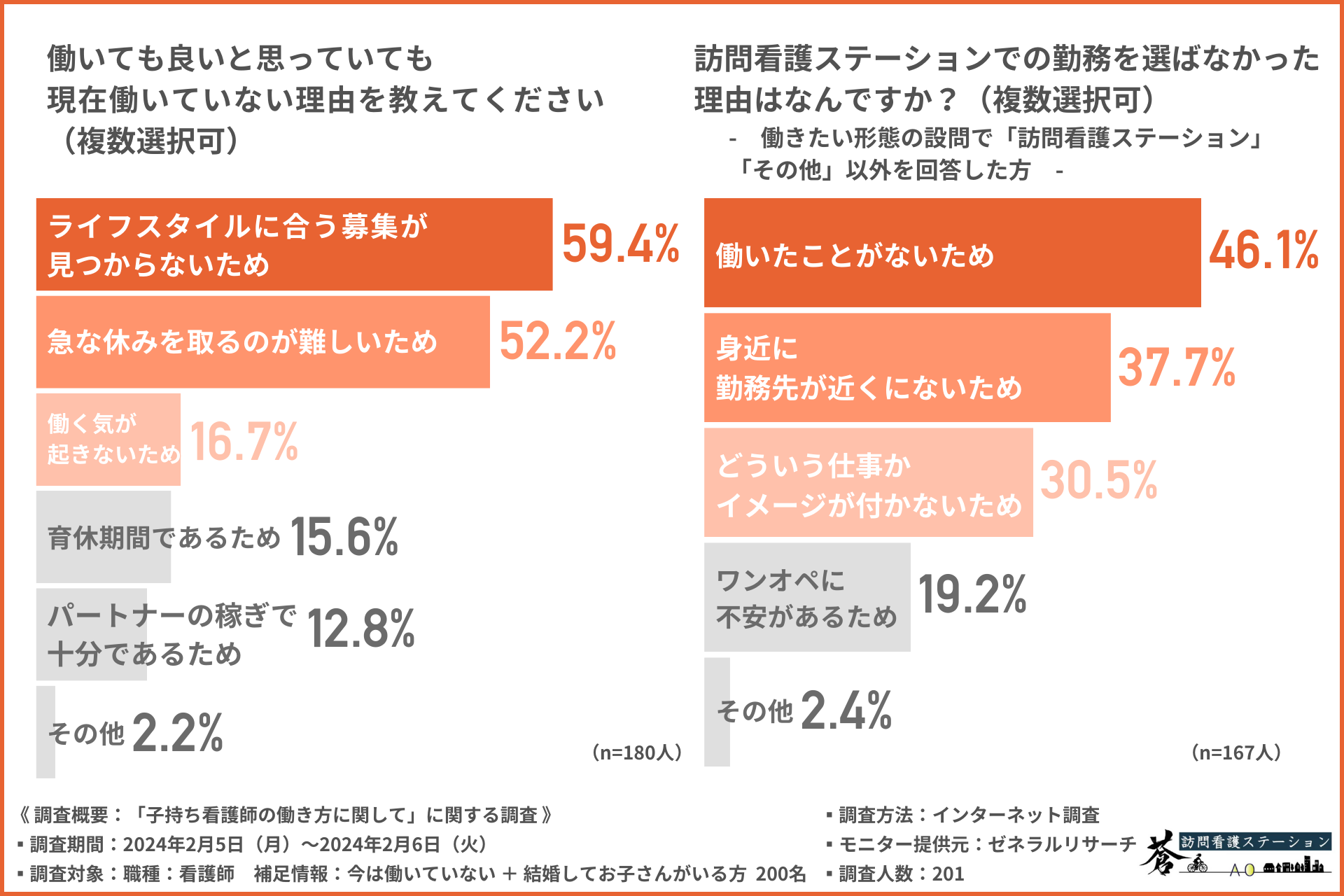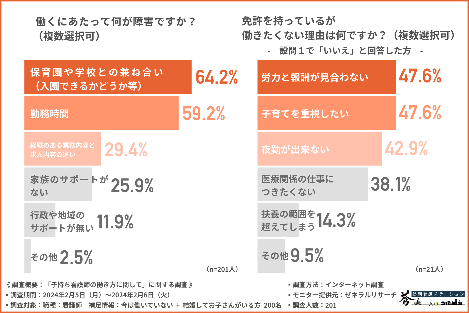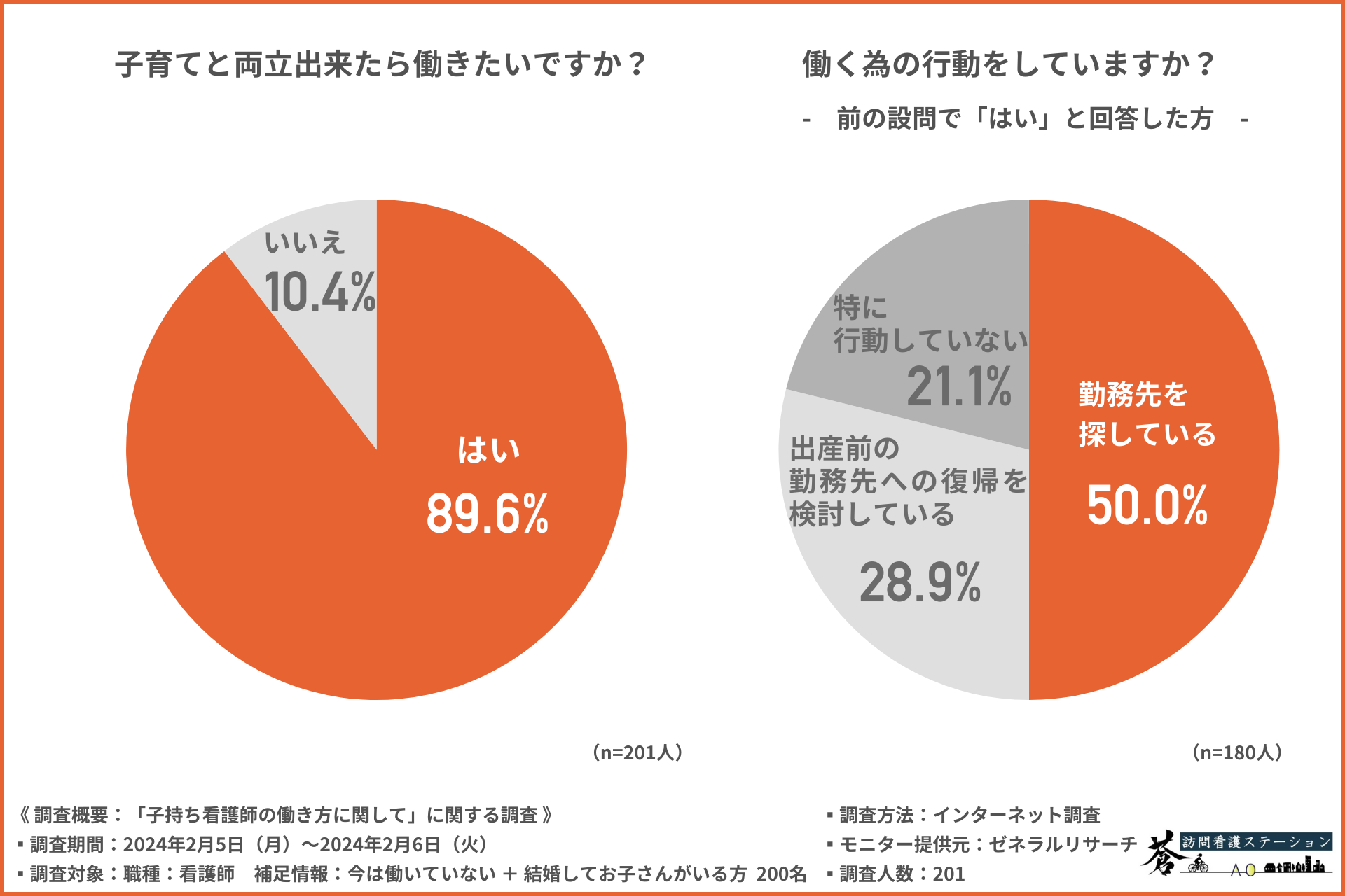 そこで今回、訪問看護ステーション蒼(https://ao-minato-tokyo.jp/)は、看護師(今は働いていない + 結婚してお子さんがいる方)を対象に「子持ち看護師の働き方」に関する調査を実施しました。