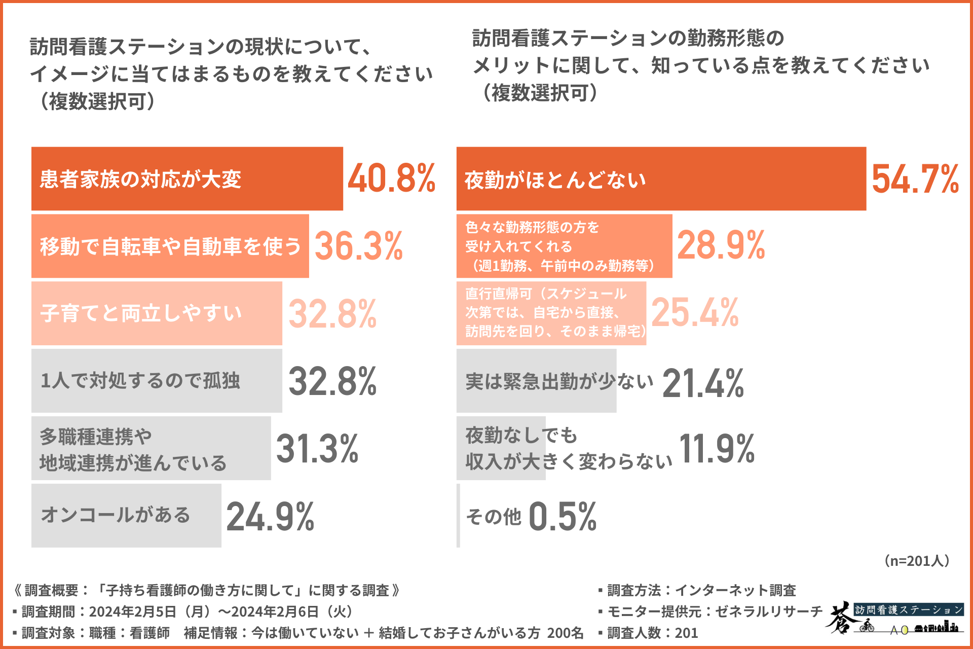「訪問看護ステーションの現状について、イメージに当てはまるものを教えてください(複数選択可)」と質問したところ、『患者家族の対応が大変(40.8%)』と回答した方が最も多く、『1人で対処するので孤独(32.8%)』という敬遠気味なイメージが目立ちます。