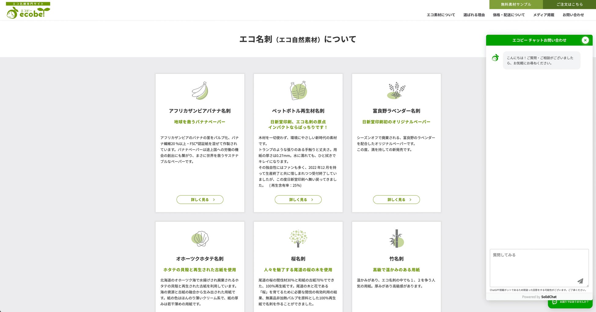 多くのリピーターのお客様からのご支持を受け、この度、新たな素材も追加し、よりご注文しやすくなるようホームページをリニューアルしました。環境に配慮した製品やサービスが増える中、持続可能な資源を利用した印刷サービスや、リサイクル可能な材料を使用した製品、バナナペーパーなどを強調し、企業の社会的責任(CSR)に関心が高い顧客層に響くように制作しました。