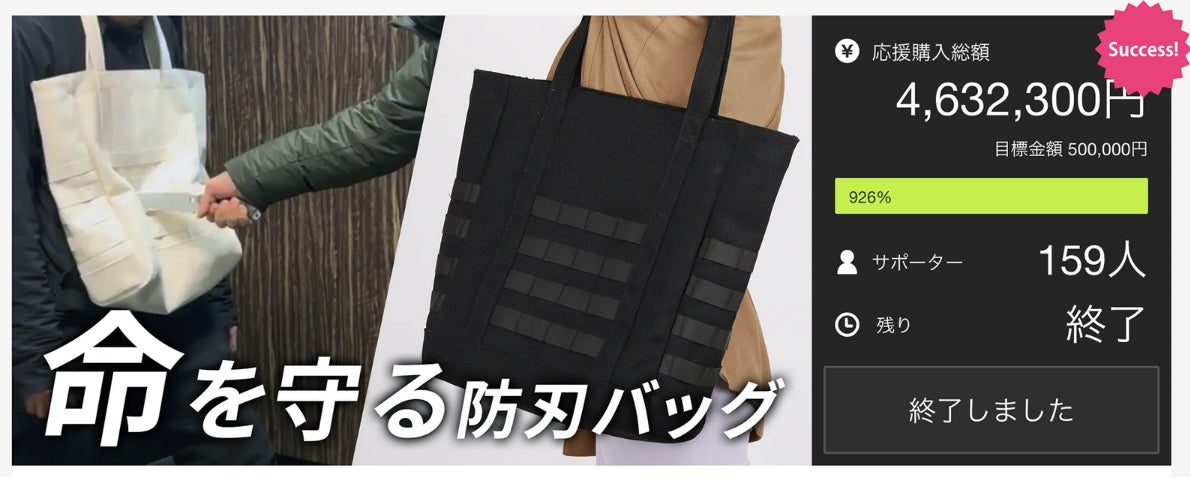 私たちは2024年3月に初のプロジェクトとなる「防刃ベスト屋が作るタフで頼れるキャンバスバッグ|SSPトート」をリリースしました。おかげ様で460万円を超える支援をいただき、FNNプライムオンライン取材や、日経MJ紙注目商品として取り上げていただくことが出来ました。