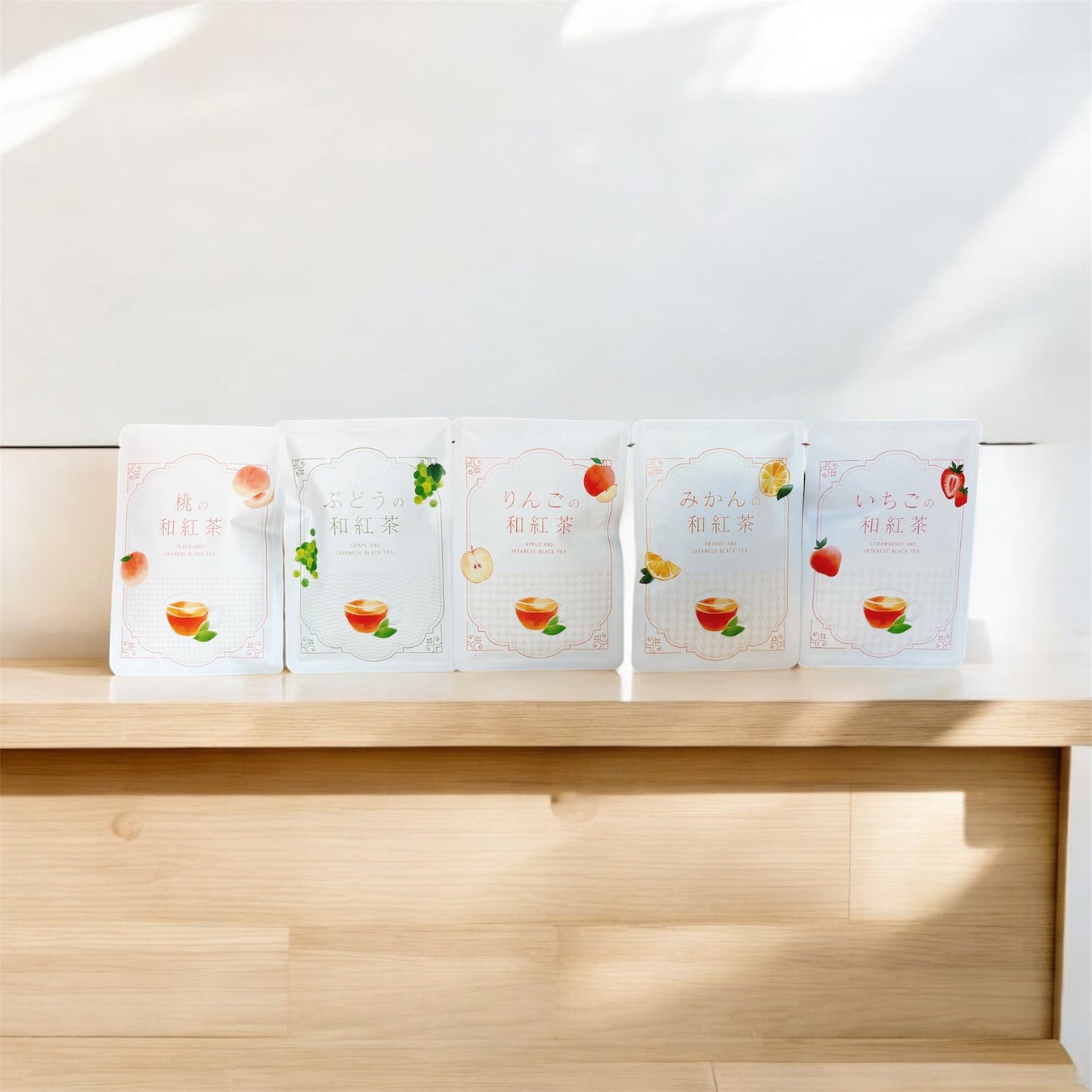 かわいいフルーツ柄の化粧箱にフルーツ和紅茶 5種類が各4個ずつ入ったセットです。