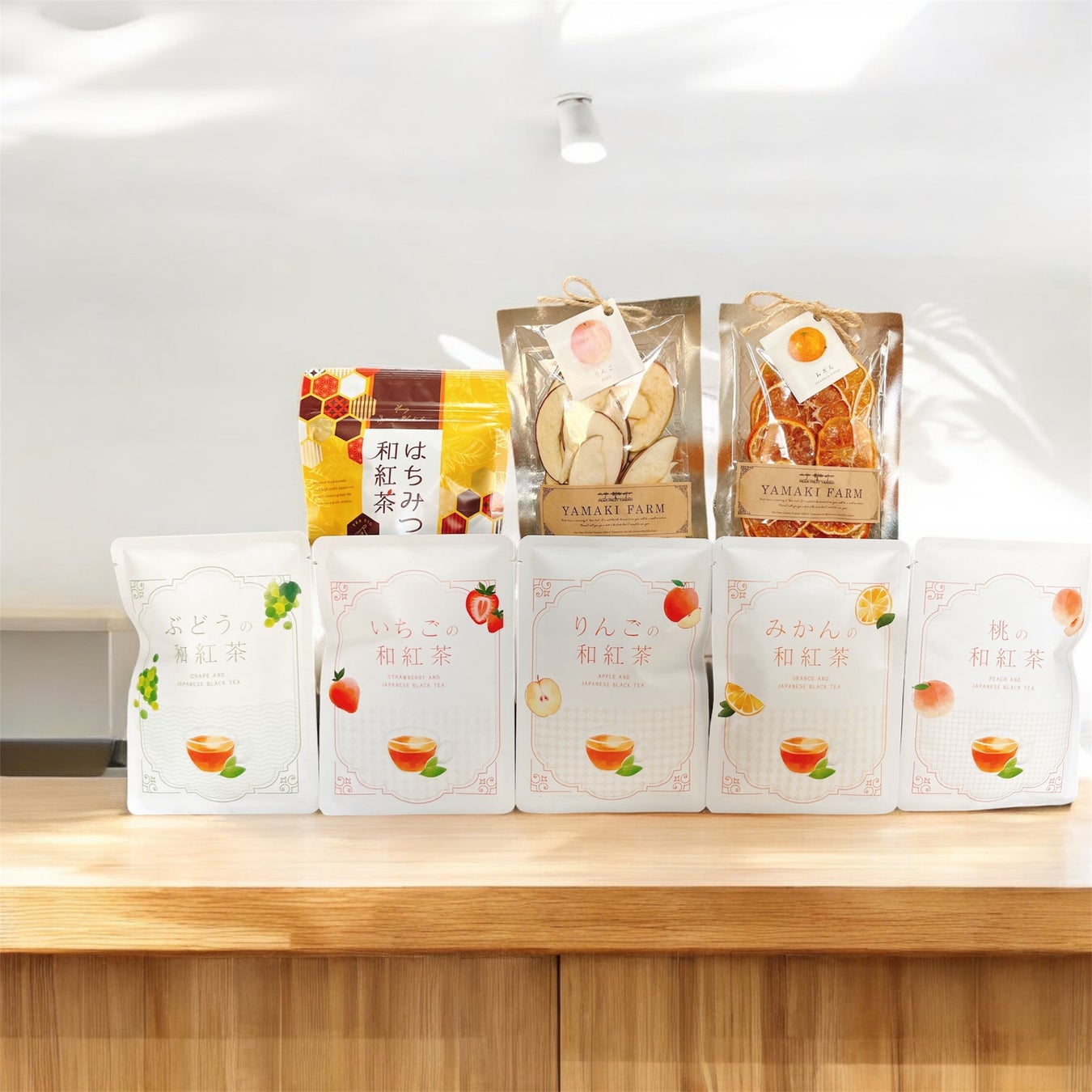 フルーツ和紅茶 5種、はちみつ和紅茶 1種+ヤマキ農園様 ドライフルーツ「りんご」と「みかん」が入ったセットになっています。