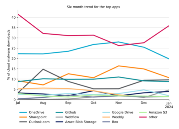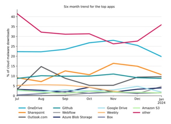 OneDriveとSharePointがマルウェアのダウンロードに使用されたクラウドアプリのリストで再び上位にランクインし、これらのアプリをサイバー攻撃者が非常に好んでいることが明らかになりました。