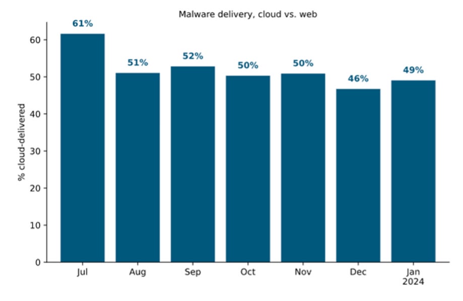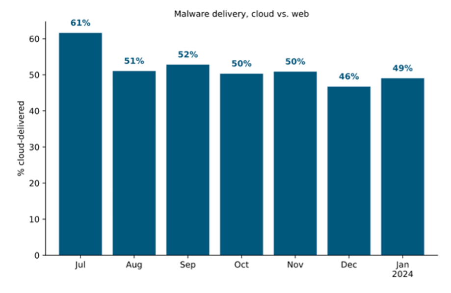 攻撃者は、一般的なクラウドアプリを介して悪意あるコンテンツを配信することで、検知を回避しようとします。攻撃者はマルウェアの配信にクラウドアプリを悪用することにより、主にドメインやURLのブロックリストに依存していたり、クラウドトラフィックを検査しないといったセキュリティ制御の回避が可能になります。2024年1月、すべてのHTTP/HTTPSマルウェアのダウンロードのうち49%は、一般的なクラウドアプリから配信されました。過去6カ月にわたり、一般的なクラウドアプリからのマルウェアダウンロードの割合は50%前後で推移しています。